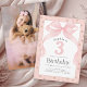 A cute girly pink birthday party invitation for a little girl turning three, this design features a pastel pink coquette bow with trailing ribbon and a matching pink border with shimmering polka dots. The simplicity of this design blended with the feminine pink bow makes it a lovely choice little girls. The back of the invitation has a photo template to personalise with a photo of the birthday girl. Personalise the text template with your event details. This invitation is available in both printed and instant download digital formats for sending by email.