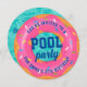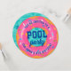 This retro inspired birthday party invitation features bright blue pool water, a sweet pink doughnut inner tube, and fun typography. The back has the same water background with all the important details. The look is a fun choice for any kids pool party!