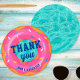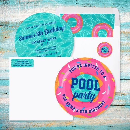 This fun birthday party thank you card features bright blue pool water, a sweet pink doughnut inner tube, and fun typography. The back has the same water background with plenty of space to write a personal message. The look is a fun choice for any kids pool party... See the collection for coordinating items!