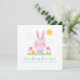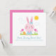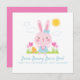 A cute pink personalised Easter card featuring a pink Easter Bunny surrounded by Easter Eggs and tulips. Cute for a daughter or granddaughter. Designed for you by Blackberry Boulevard.