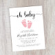 Cute baby girl shower postcard invitation with "oh baby" in a stylish script with swashes and a pastel pink watercolor of baby feet.