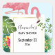Baby Shower or other event, save the date stickers. A cute and whimsical pink flamingo. Surrounded by green tropical leaves, and red and yellow hibiscus flowers. A rectangle shaped, gold gradient frame in the centre.