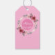 It has pink background. Pink and white Flowers Wreath on it. You can customise the date and the image. Get this Cute Pink Floral Wreath Birthday Gift Tag for your loved ones