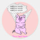 This card features a pink flying pig on a pink starry background. Background colour can be changed in the 'customise it' tab.