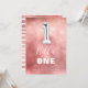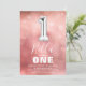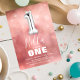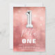 Modern first birthday party invitation designed with an ombre watercolor pink background, transparent bubble confetti, and a big silver number one helium balloon. The child's name is written in big calligraphy white text with a simple birthday template underneath that is easy to customise.