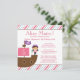 This 5.25x5.25 square girls birthday party invite has a pink and purple pirate theme! There is a brown hair pirate sailing on her pirate ship standing next to a parrot on the left side. At the top and bottom borders, there is a trendy pink, white, taupe, and aqua stripes pattern. On the right, you can easily customise your party information. Some design elements by STOCKBERRY STUDIO