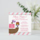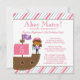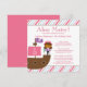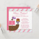 This sweet 5.25x5.25 square girls birthday party invite has a pink and purple pirate theme! There is an African American / ethnic pirate sailing on her pirate ship standing next to a parrot on the left side. At the top and bottom borders, there is a trendy pink, white, taupe, and aqua stripes pattern. On the right, you can easily customise your party information. Some design elements by STOCKBERRY STUDIO