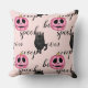 Adorably spooky throw pillow featuring a pink jack-o'-lantern, black cat, and playful texts like spooky, creep, and meow set against a soft pastel pink background. This fun and quirky Halloween pattern is perfect for cat lovers, pastel goths, and fans of kawaii-style spooky vibes.