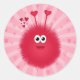 A cute, pink and fuzzy love bug has hearts on the ends of his antennae,a big friendly smile, and tiny hearts floating above him. He's on a pink sunburst background with little hearts all over.