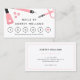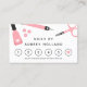 Cute loyalty card for your nail business with pink nail artist tools and little gems. Add your name too. The loyalty punch card is for the sixth visit or treatment at a discount, with a pink heart marking it. Write your name, business, and contact information on the back with black text on a white background with pink as the accent colour.