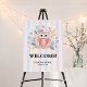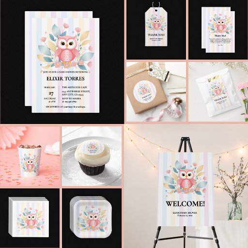 Adorable pink owl baby shower invitation featuring a pastel floral arrangement and soft striped background in pink, blue, and yellow hues. Perfect for gender-neutral or girl baby showers. Printable and customisable! If you need any other matching product or customisation, kindly message via Zazzle.