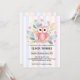 Adorable pink owl baby shower invitation featuring a pastel floral arrangement and soft striped background in pink, blue, and yellow hues. Perfect for gender-neutral or girl baby showers. Printable and customisable! If you need any other matching product or customisation, kindly message via Zazzle.