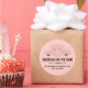 Personalised pig farm business stickers with a drawing of a cute pink pig's face. Wearing a black bow tie. Lifted up by his black cloven hooves and peering over a table. Cute and whimsical drawing. Set on a pink background with some faded hearts here and there.