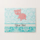 Cute Pink Pig; Teal Damask Jigsaw Puzzle