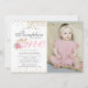 Adorable pink pumpkin fall first birthday invitation, featuring a photograph, a classic white background, pink watercolor florals with green and gold botanical foliage, faux gold glitter confetti, chic watercolor pumpkins and an elegant birthday template that is easy to customize. Perfect party invitation to celebrate your little pumpkin turning one!