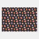 A set of wrapping paper sheets for Halloween featuring three cute patterns: one with a bunch of cute monsters against a black background; the same pattern against a white background; and one sheet with matching stripes in orange, white, purple, and pink.