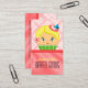 © Sunny Mars Designs. Cute Pink Salmon Cupcake Character Bakery Business Cards Template - Adorable custom cake shop business card with pretty cartoon face, yellow blonde frosting hair, little hat, blue butterfly, hibiscus flower, wrapper, with light pink plaid and salmon silk background.