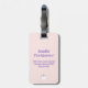 A luggage tag personalised with a name and address. Designed with an illustration of a cute sleeping kitty cat. Eyes closed looking happy and peaceful. Set on a pale pink background.