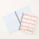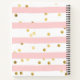 A fun pattern for girls with horizontal pink and white stripes with golden dots scattered about makes this a cute choice in notebooks. A text template along the left side of the design spells out your name or other desired text. Simply personalise the sample text as you wish for a custom notebook for home, office, or back to school.