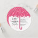 Modern round circle die cut baby shower invitation featuring a pink polka dot umbrella for a girls baby shower. Flip our umbrella baby shower over to view a pretty pink and white polka dots back for an extra special touch. Perfect for a summer baby shower, spring baby shower, fall baby shower or winter baby shower.