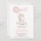 Cute bear themed first birthday invitation for a baby boy featuring a teddy bear in a blue vest, flying goggles, and balloon. This beary first birthday invitation also features a non editable modern calligraphy text.