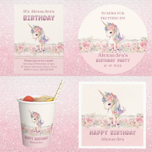 Customise this Cute Unicorn Birthday Thank You Sticker and add a Magical touch to your Little Girl's Party Favours. Friends and Family will love the Pink Glittler Letters and Whimsical Unicorn prancing through Dusty Pink Flowers, creating a Soft, Shabby Chic look.