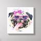 This design features a cute portrait of a pug wearing pink heart sunglasses and a pink bow in a splashy watercolor style.