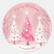 Look at the cute pink and white Christmas trees in this whimsical retro watercolor holiday scene. Of course, there is a lovely pink background, too. Included are stars, garlands, berries and sparkly lighting effects. There are also fun ephemera and details that add to the playfulness. All of the text can be changed, including "Merry Christmas". Be sure to edit the example family name and date. While we have shown the sticker here as the round shape, it also looks good in the square shape, if you prefer that.