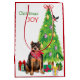 On each side of this Holiday gift bag, a black and tan Pit Bull Dog wears a red scarf while he sits beside a Holiday tree. Around the dog brightly wrapped gift packages are scattered about. A bullfinch is landing on the Christmas tree. The red and green text says "Christmas JOY".