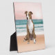 Cute Pitbull Dog Sitting on Beach with sunset Plaque
