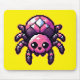 This image showcases a pixel art depiction of a spider, rendered in a charming, retro 8-bit style. The spider’s body is predominantly pink, accented with darker shades and light blue highlights, creating a striking contrast against its black outline. This pixelated arachnid exudes a playful yet edgy vibe, reminiscent of classic video game aesthetics. The charm-like design suggests symbolism related to luck and protection, while the colours pink and black add layers of mystery and complexity. The pixel art style not only evokes nostalgia but also highlights the intricate artistry involved in digital creations.