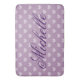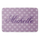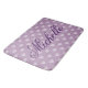 Cute plum heart pattern bath mat with custom name. Trendy heart polka dots design with custom background colour. ie lavender purple. Chic stylish typography for monogram initial letters or name. Create your own classy bathroom interior with this stylish polkadotted print template. Personalised name initials. Pretty home decor ideas for your house. Unique wedding gift for new home / housewarming party.