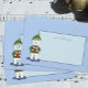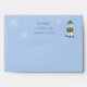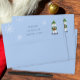 A whimsical blue Holiday envelope featuring a polar bear and some snowflake . Personalise it with your Holiday greeting , your name and address .