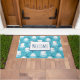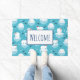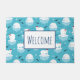 A welcome door mat with a cute Christmas pattern featuring polar bears standing on floating ice wearing red santa hats. Little igloos, snowflakes and fish surround these adorable polar bears chilling on the water. Light blue background. A white rectangle with a blue border layered over top, with Welcome written inside. Cute and whimsical holiday design.