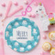 Paper plates with a cute Christmas pattern featuring polar bears standing on floating ice wearing red santa hats. Little igloos, snowflakes and fish surround these adorable polar bears chilling on the water. Light blue background. Cute and whimsical holiday design. Merry Christmas written inside a white frame layered over top.