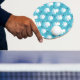 Ping pong paddle with a cute Christmas pattern featuring polar bears standing on floating ice wearing red santa hats. Little igloos, snowflakes and fish surround these adorable polar bears chilling on the water. Light blue background. Cute and whimsical holiday design.