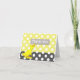Sweet baby gift thank you note card, with fun yellow and white polka dots, on the top and grey with white polka dots, on the bottom of the card. A cartoon yellow duck holding a grey sign reading Thank You decorates the front. Personalise the white and black text to read what ever you want. The perfect thank you for all your baby gifts.