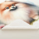 A fluffy Pomeranian dog with a vibrant orange and white coat, featuring large, expressive eyes and a cheerful expression. It stands amidst soft, pastel-coloured flowers and gentle watercolor splashes, creating a warm and inviting atmosphere. The background is light and airy, enhancing the dog's fluffy fur and playful demeanour.