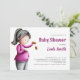 Simple and bold baby shower invitation with an illustration of the mother to be wearing a pink t-shirt and holding a pair of baby sleepers. Illustrated and designed by Patricia Alvarez.