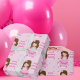 This adorable pink princess birthday party wrapping paper features a pretty brunette little girl wearing a beautiful pink ball gown. Personalise this cute children's party gift wrap with your child's name and message between the fun heart pattern.