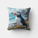A puffin themed throw pillow. A beautiful vibrant colourful ai illustration of a puffin watching the ocean waves by the sea shore surrounded by rocks, dunes and flowers.