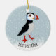 Cute Puffin Ornament on snowy background, with customisable text on both sides.