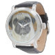 Adorable closeup pic of a cute pug on a leather strap wristwatch.
