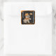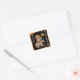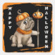 This Halloween sticker for kids shows an adorable little Pug puppy wearing a pumpkin hat and holding a stick Jack o' Lantern. Vertical white text at the sides says Happy Halloween. Everything is placed on a black distressed edge background, with a Halloween orange border. Perfect for sealing treat bags or Halloween cards!