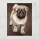 Photo of an adorable pug puppy standing on a dark wood floor looking directly at the camera.