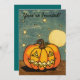 This cute Halloween design features a jack-o-lantern pumpkin against a starry sky with a full moon. Image has a worn texture for a vintage look. Customise the text for a perfect invitation to your party or event.