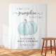 Cute baby boy shower tapestry welcome sign and photo prop featuring a pastel blue pumpkin watercolor and "A Sweet Little Pumpkin Is On His Way" written in a mix of grey typography and a stylish script with swashes. Personalise with the name of the mother-to-be and the shower date.