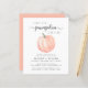 A cute budget-friendly couples baby shower invitation featuring "A Sweet Little Pumpkin Is On Its Way" in simple grey typography and a stylish script with swashes, and a pastel orange pumpkin watercolor. Specify the baby’s gender if desired (e.g., "is on his way").