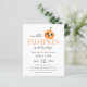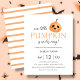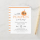 Simple and modern Halloween baby shower paper invitation featuring a cute pumpkin on a clean white background. With the words " our little pumpkin is on his way " and stripe pastel orange and white reverse. Ready for easy personalisation.