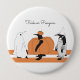The product design features three cute penguins in Halloween costumes: ghost, pumpkin, and scarecrow. This funny animal illustration with personalised text makes a whimsical and unique Halloween pin button.
